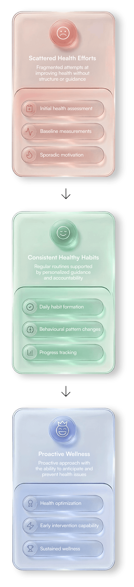 Our focus is to help you stay ahead of potential issues through daily insights, expert guidance, and a system that understands you as a whole person. We bring together your habits, clinical data, nutrition, mental well-being, and lifestyle patterns so your health is always guided in the right direction.