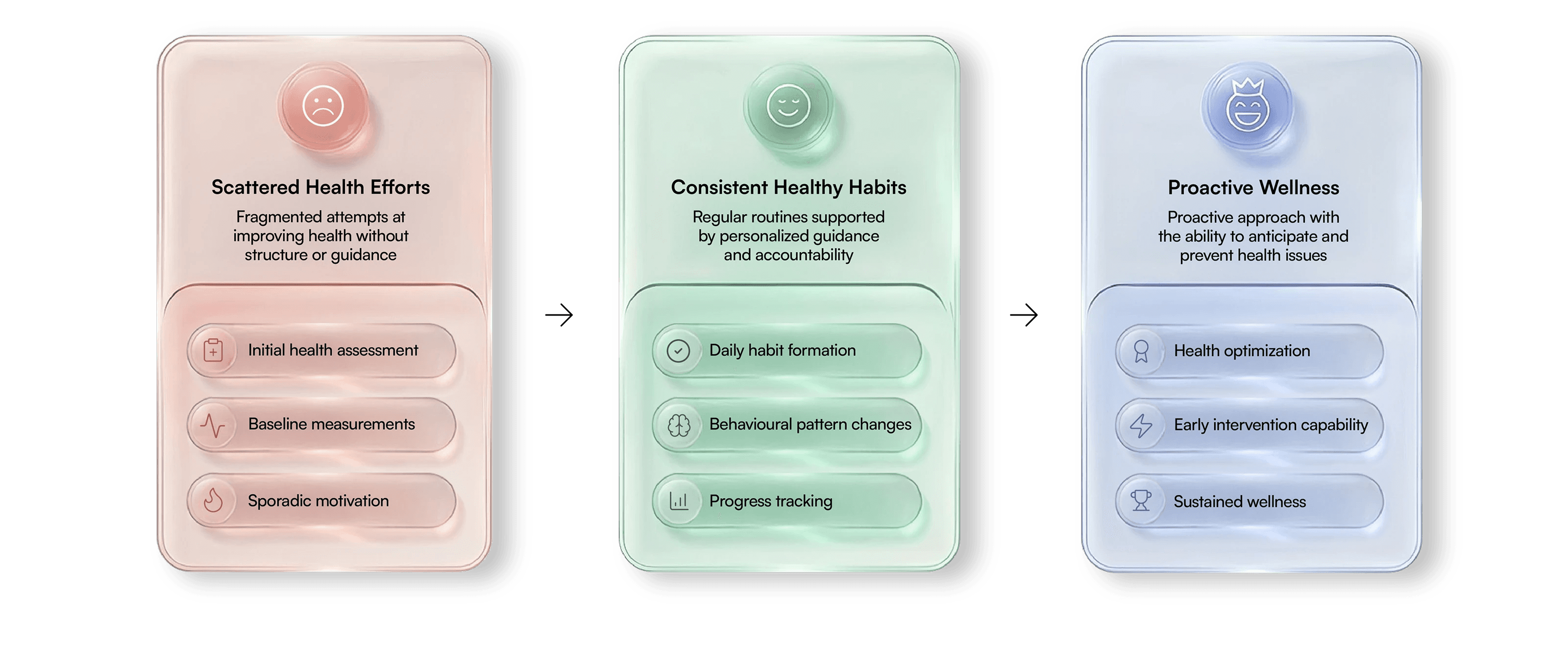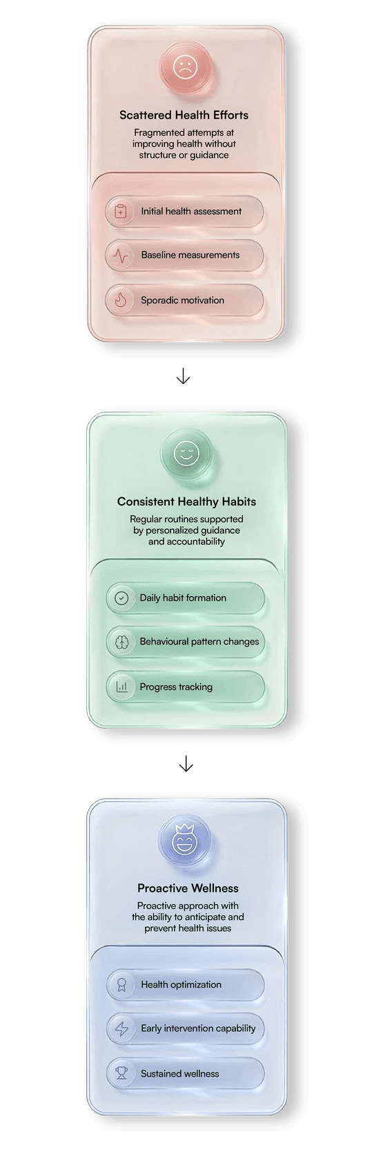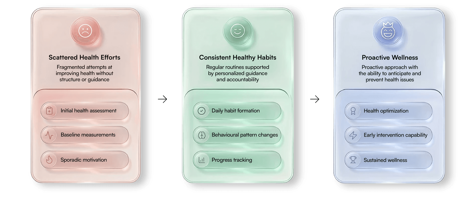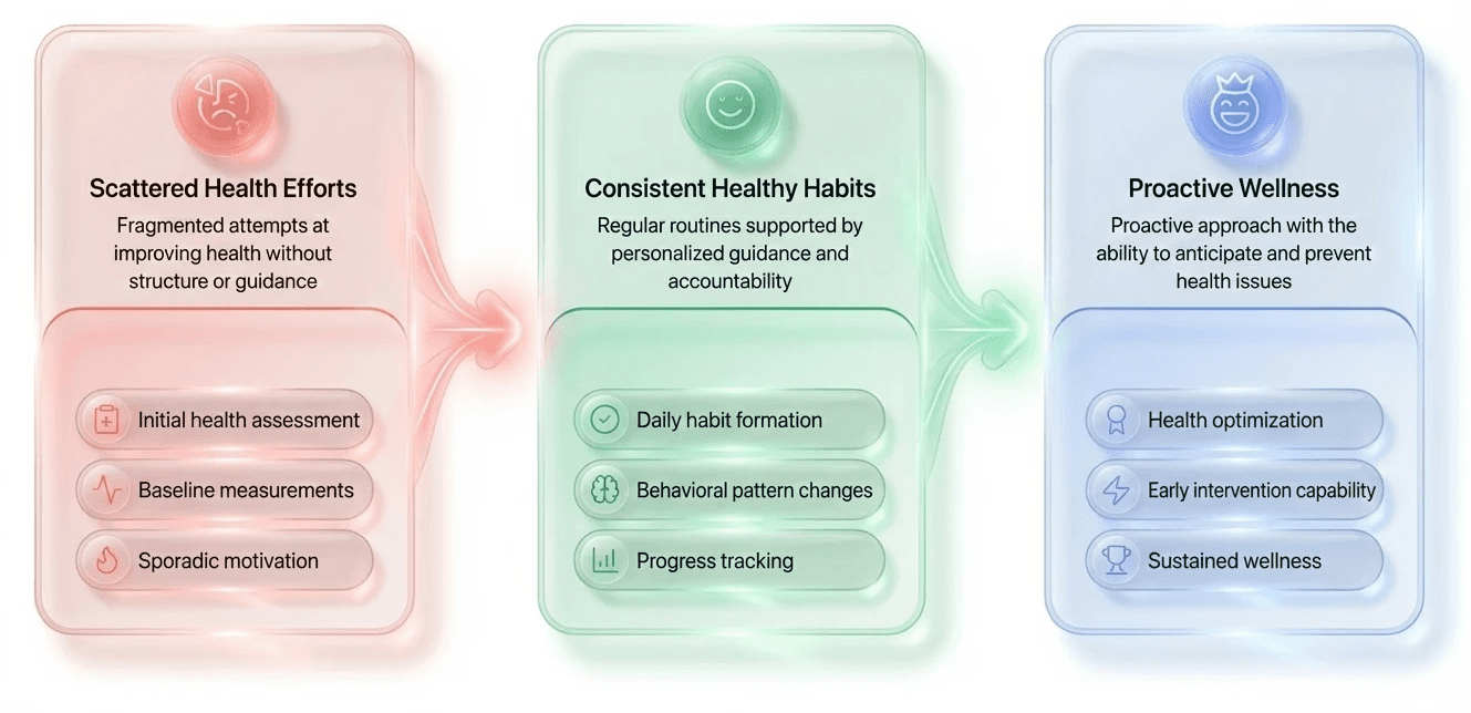 Every health journey moves through these stages. Hubo One guides you from scattered efforts toward lasting wellness.